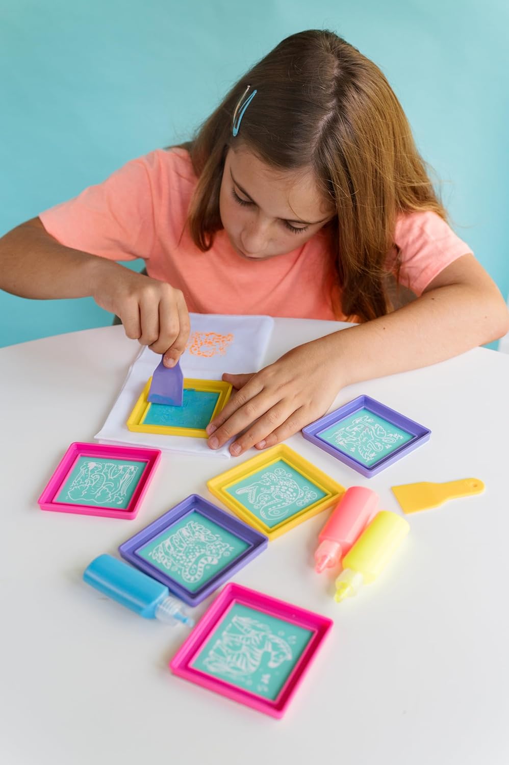 Includes a 50x50cm fabric cloth for first print projects. Use the kit to print on t-shirts, tote bags, cushions, etc (not included). 3 colours are included but kids can have fun mixing them up to create extra colours.