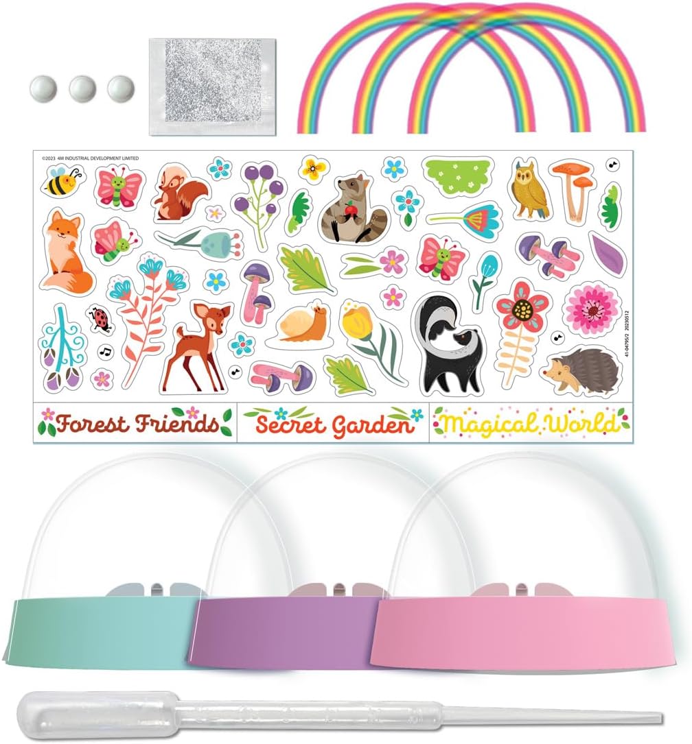 4M Glitter Rainbow Snow Domes kit lets you create three unique, glittery snow domes featuring a secret garden, a magical world and forest friends. The kit includes over 50 stickers for decoration, transparent rainbows and glitter to bring your creations to life. It's a fun and creative activity that allows kids to design and personalize their own beautiful snow domes, adding a touch of sparkle and imagination to their world.