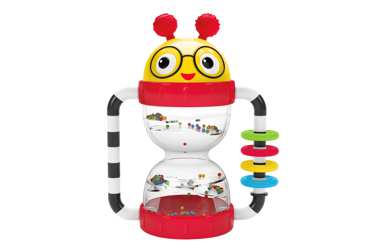 aby Einstein Cal’s Sensory Shake-up Activity Rattle is a multi-sensory toy designed to engage baby in sensory play and encourage developmental milestones. 5 sensory features let baby explore new textures, build fine motor skills, and stimulate cause and effect learning with this BPA-free toy. Baby will love to explore the texture of Cal’s antennae or create some noise by shaking the hourglass beads to create rattle sounds. For cause-and-effect discovery, infants can twist Cal’s head to make a clicking sound or use the baby-safe mirror on the toy’s base to promote self-discovery and delight. 4 rattle rings encourage fine motor skills or help parents teach color learning to toddlers. High contrast colors stimulate baby’s visual development, and two easy-to-grasp handles make this battery-free toy a perfect way to engage baby on-the-go