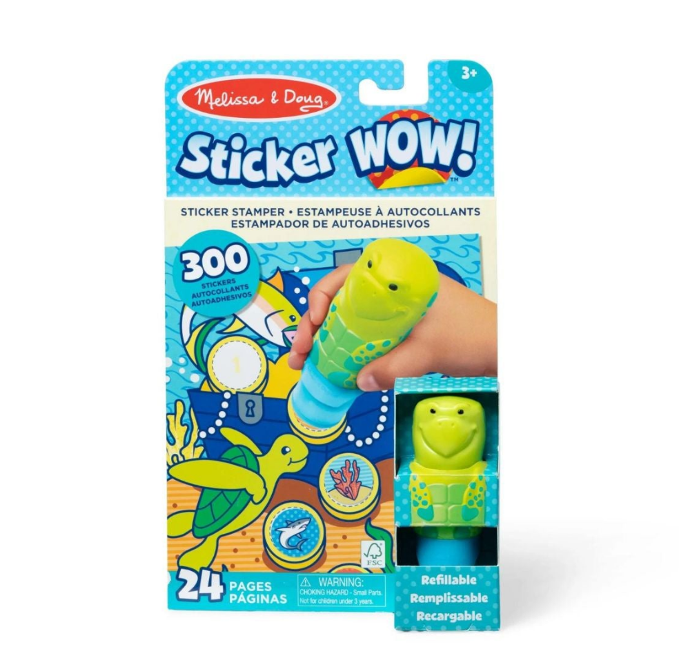 Melissa & Doug Sticker WOW!™ is a whole new way to play with stickers! Let the adorable, collectible Kelp the Sea Turtle stamp, stamp, stamp its way through 24 pages of fun-filled, ocean-themed counting, matching, and search-and-find activities. The refillable sticker stamper comes pre-loaded with a sticker stack of 300 assorted stickers – with 100 unique designs in every stack, each sticker is a surprise! Themed refill packs are sold separately and are compatible with any Sticker WOW!™ sticker stamper. Stickers are not reusable, but are easy to remove if necessary. Fill in the activity pages and use for creative art projects, such as bookmarks, posters, cards, and more. Easy-to-remove stickers and the convenient on-the-go format with built-in sticker stamper storage makes Sticker WOW!™ (patent pending) a great mess-free travel activity. Sticker WOW!™ promotes fine motor skills, encourages creative play, and it’s satisfying, fidget fun!