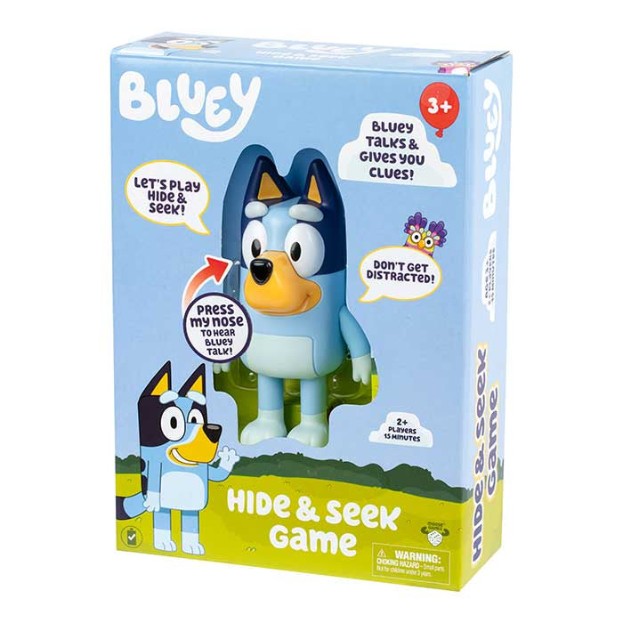 Now your little ones can bring home the fun and imaginative play of Bluey with the Bluey Hide & Seek Game! Kids can really play Hide and Seek with Bluey in their house with this adorable, interactive, electronic figure. Hide Bluey anywhere and press her nose to start the built-in timer. Bluey talks and giggles every few seconds to help lead you in the right direction to find her. Will your child and their friends find her before the timer runs out? The first person to find Bluey within the time wins! When the player finds Bluey, they can press her nose again to go into "Dance Mode" so everyone can dance to the Bluey theme-song. The cute electronic Bluey figure is articulated and stands at 15 cm / 6 inches tall. Every Bluey fan will love playing this exciting version of Hide and Seek. Makes a great party game or fun game with family and friends for 2 or more players, ages 3+.