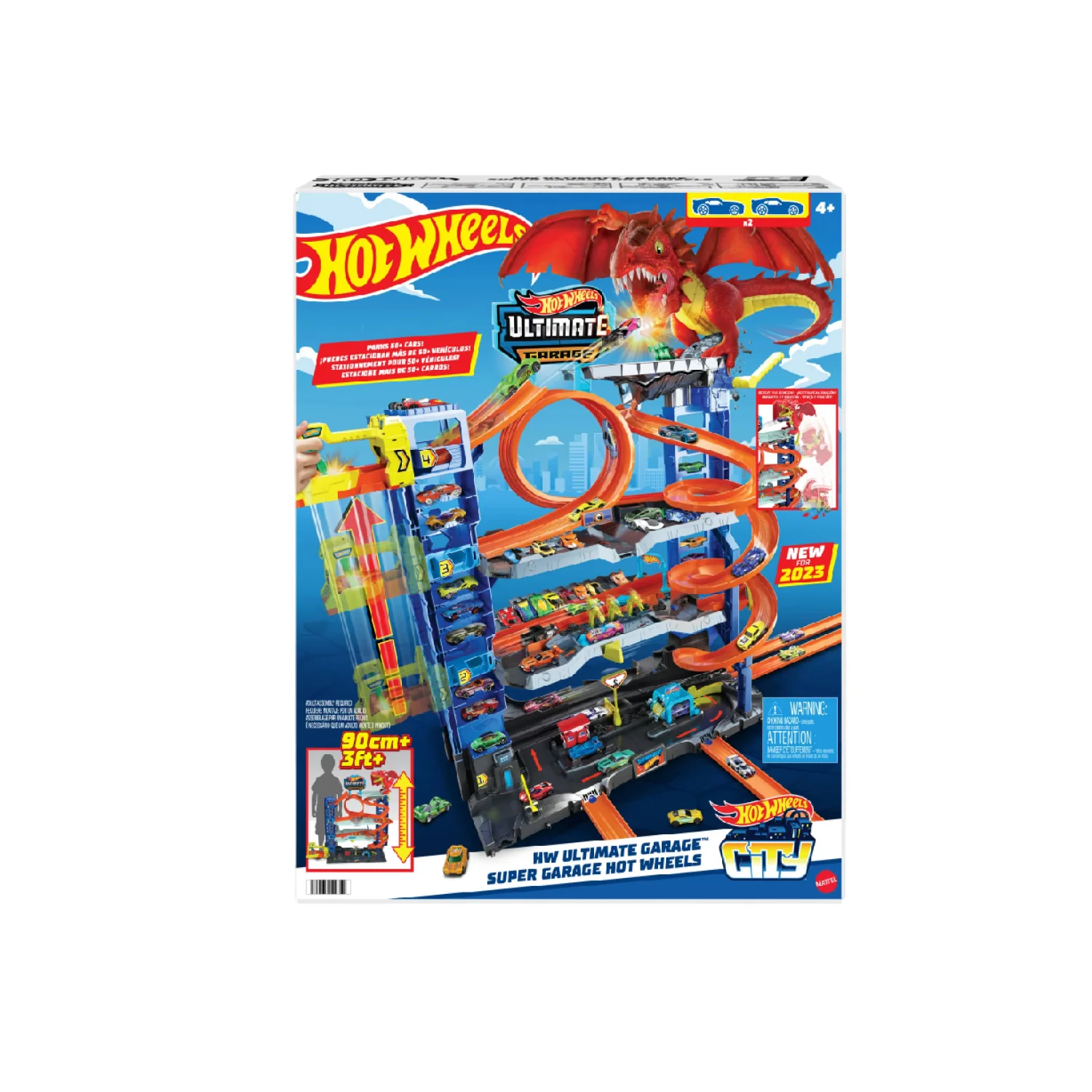 Explore all four levels of racing, stunting and storytelling in the Hot Wheels City Ultimate Garage just like the kids in the Netflix series 'Let's Race'. Each level inspires track-play adventures including side-by-side racing, loop stunts and an epic battle with a car-eating dragon. The set comes with two Hot Wheels® vehicles and has enough parking for more than 50 1:64 scale toy cars. It also connects to other sets so kids can build out their Hot Wheels™ City. Additional sets sold separately. Colors and decorations may vary.