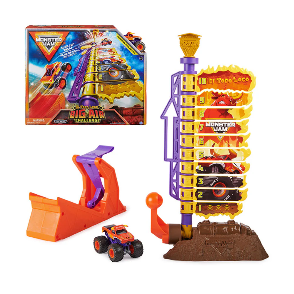 Reach new heights with the Monster Jam El Toro Loco Big Air Challenge. This playset is over 50cm tall and features an exclusive El Toro Loco Monster toy truck, launcher and panel target. With 5 different positions on the launcher, aim high or go the distance with your other 1:64 scale monster trucks (sold separately). Have your truck reach the top for explosive action and see the fireworks display just like in the World Finals XXI with your own monster trucks. Recreate the same stunts at home or turn the handle to see who can reach furthest distance for extended play. This playset makes the perfect addition to your monster trucks collection for pretend play and imaginative fun. Bring the high-octane excitement of Monster Jam home with favourite characters like Grave Digger and El Toro Loco. Monster Jam toys like remote control cars and trucks are the perfect gifts as girl and boy toys, ages 3 and up. Show off your skills with the Monster Jam El Toro Loco Big Air Challenge.