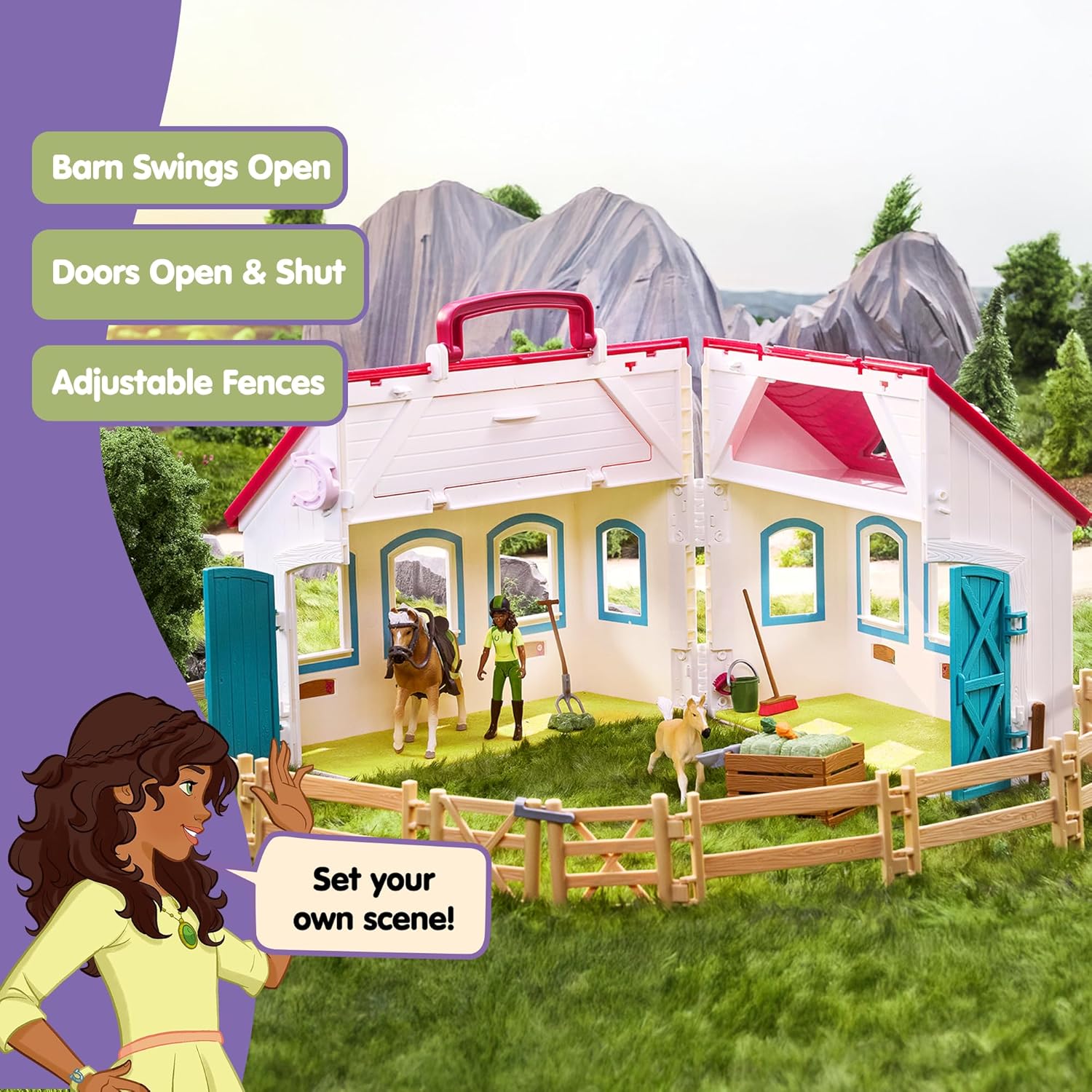 The Lakeside Open Stable “Little Horseshoe” can be folded up into a suitcase and taken anywhere. All the accessories like the hay bales the bundle of carrots or the finger comb can be safely stored in the extra compartment under the roof. The fence elements for the paddock are also located there. So nothing will get lost on the way.
