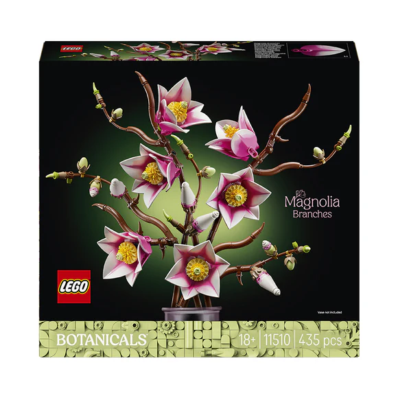 Immerse yourself in nature and create beautiful flower decor with this LEGO® Botanicals Magnolia Branches (11510) building set for adults. Relax as you craft the floral display, which includes 5 highly detailed magnolia branches. This is one of the only LEGO Botanicals sets to include branches and the magnolia petals feature 2 shades of color for added realism. There are also lots of fun details to discover, including cupcake pieces for the flower carpels, brown frogs as wood knots, egg piecesfor the buds and ice cream swirls for the furled bud tips. Once built, the LEGO flowers become gorgeous floral decor and can be combined with other LEGO Botanicals sets (sold separately) to create a larger and customized display. This building kit makes a thoughtful birthday, Valentine’s Day, Mother’s Day or housewarming gift for women, men and nature lovers. It’s also available in the LEGO Builder app, where budding florists can rotate their build and track their progress. Set contains 435 pieces.