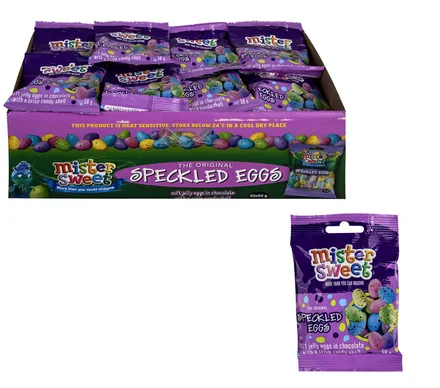 Enjoy a classic Easter favourite with these Mister Sweet Speckled Eggs. Each 50g bag is filled with delicious chocolate eggs coated in a colourful speckled candy shell, making them the perfect treat for Easter celebrations.