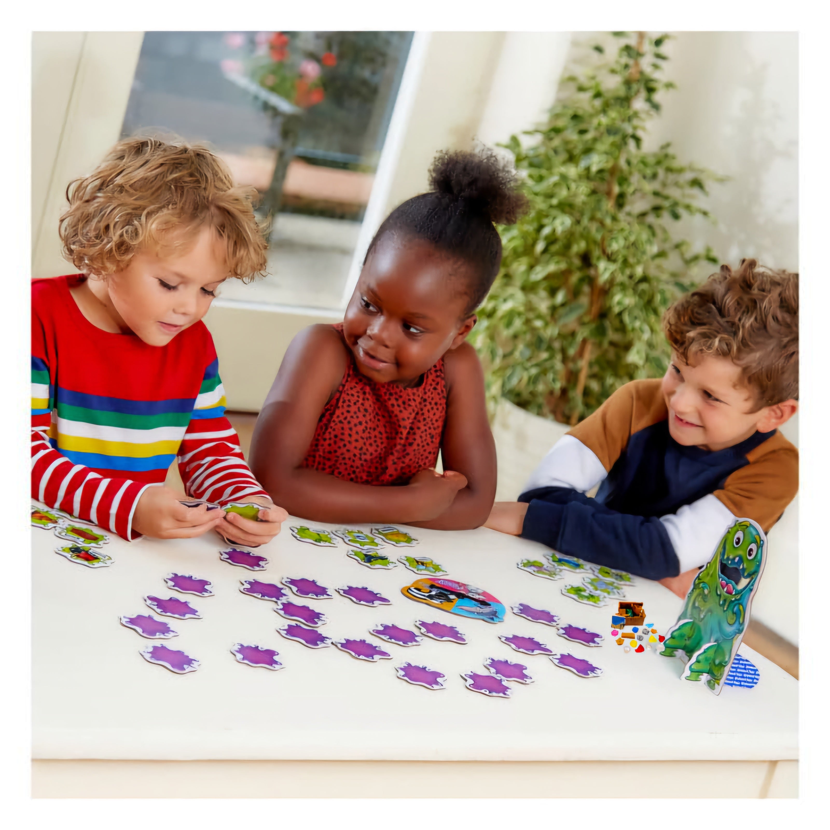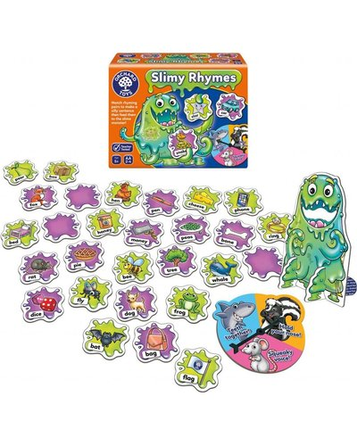 Players start with a selection of five green slime cards. Taking it in turns they choose a purple slime card - if the card rhymes with one of the cards in front of them, the player must think of a silly sentence using the two words. Once they have a rhyming sentence they spin the spinner to find out in what style they must say their silly sentence in: whilst either holding their nose, with their teeth together, or in a squeaky voice!