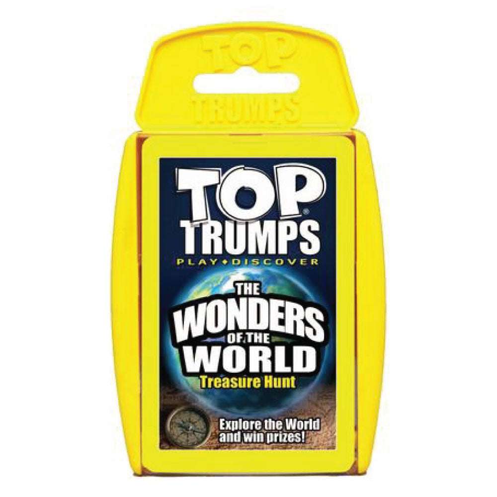 From grand canyons to wild waterfalls, we've scoured the globe to bring you Wonders of the World Top Trumps! Thirty of the most breathtaking and awe-inspiring sights that Planet Earth has to offer, including the world's most dangerous volcano (hot stuff), a gigantic South American glacier (pretty cool), and the only living thing visible from space (clue: it's not a sumo wrestler). This pack also features our Treasure Hunt bonus game - answer the questions on the cards and decipher the code to unlock some cool prizes online. Do you know the name of the world's highest mountain? We do, we climbed it and left a few packs of Top Trumps at the top for the next adventurers to find. How about its hottest desert? We slapped on the suncream and spent a few weeks there, just to make sure. The best place to spot the Northern Lights? We can now reveal that it's not Blackpool. How far to the moon? Our supersonic tape measure came in handy for that one. The world's a pretty awesome place, so what are you waiting for - grab this pack now and start wowing your mates with your mind-blowing Top Trumps knowledge.