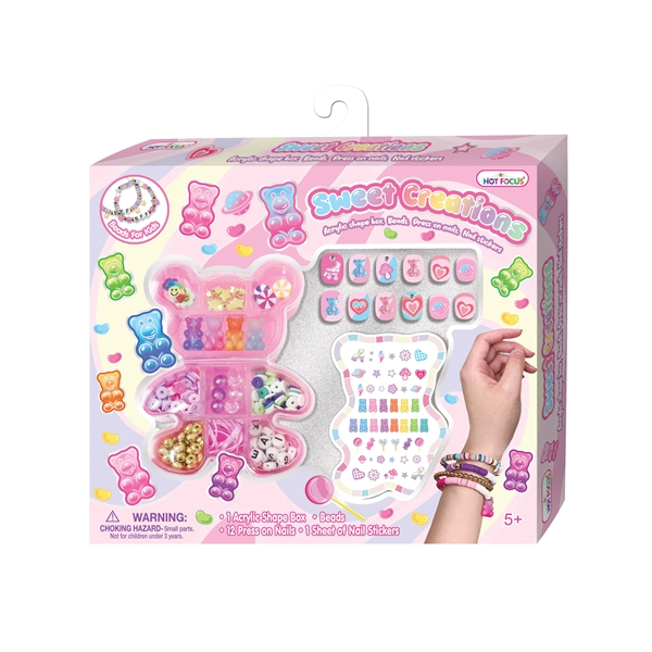 Make way for the Sweet creations,a delightful kit designed to bring hours of fun.Contains:1 x Novelty Shaped box with beads12 x Press on Nails1 x Sheet of Nail StickersSize Approx. : Size: 19.5cm x 23cm x 3cm