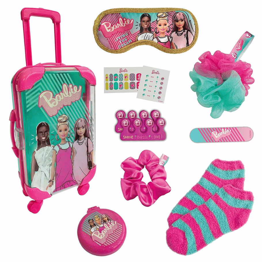 • This beautiful barbie playset is part of a charming collection of Barbie Role Play by Sinco Creations. the set includes a hair brush with mirror, fluffy ankle socks, a hair scrunchie, a shower puff, a nail file, nail stickers, an eye mask, nail decals and toe separators, all with the iconic pink Barbie branding.