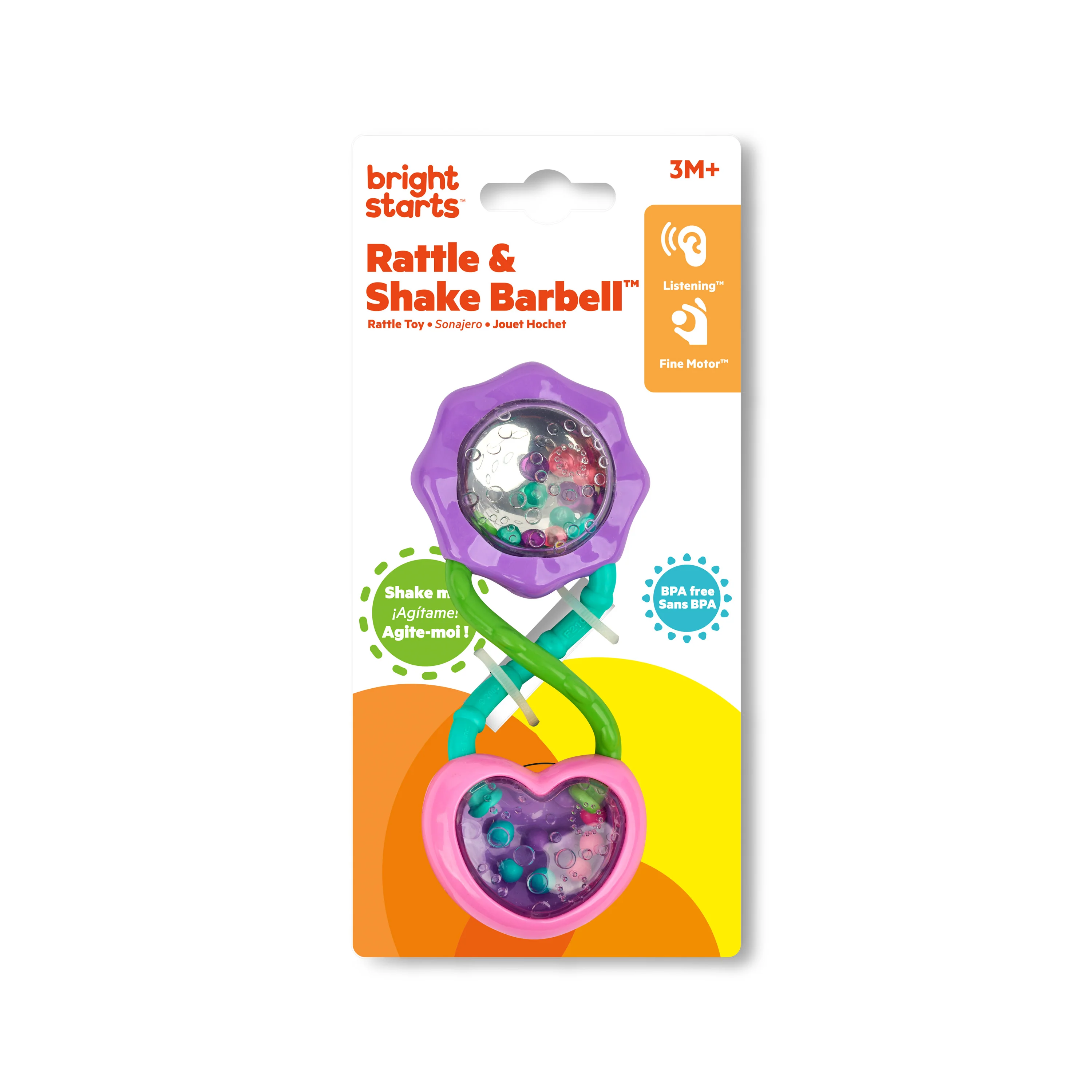 Your baby’s on the way to becoming a weightlifting champ with this barbell rattle toy from Bright Starts! With precious pink and purple details and a delicate twisty handle, this rattle is as cute as can be and as strong as your sweet baby girl. Every shimmy and shake will have your little one laughing out loud with delight. Easy to grasp handles, rattle beads and mirrored surfaces make this toy a perfect addition to the toy box. Toss in the diaper bag for smiles on-the-go!