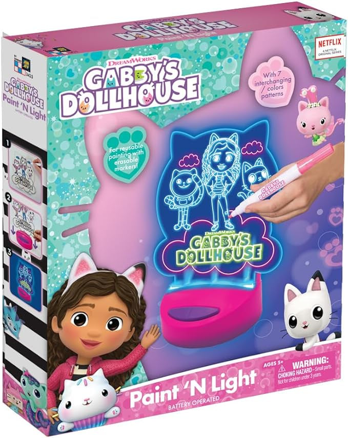 But that's not all - it also comes with 4 special erasing markers, allowing kids to unleash their creativity and create their own masterpieces on the night light's surface. Gabby's Dollhouse Paint and Lite Drawing Pad this innovative toy brings the magic of gabby's dollhouse right into your hands. Just trace the outline on the glow pad and watch as it lights up with vibrant colors. The glow pad is perfect for little ones who love to draw, create, and explore. It's not just a drawing pad, it's a world of endless possibilities. And with the included neck lanyard, you can take the fun with you wherever you go. Let your child's creativity shine with drawing pad.