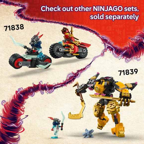 4 NINJAGO minifigures are included in the LEGO playset: ninja warriors Lloyd, Sora and Wyldfyre, each with a ninja weapon accessory, plus Master of Misfortune, Zarkt, for kids to play out epic good vs. evil battles. There is also a brick-built mini shrine with a secret message that Lloyd reveals with his translucent reveal blade accessory.