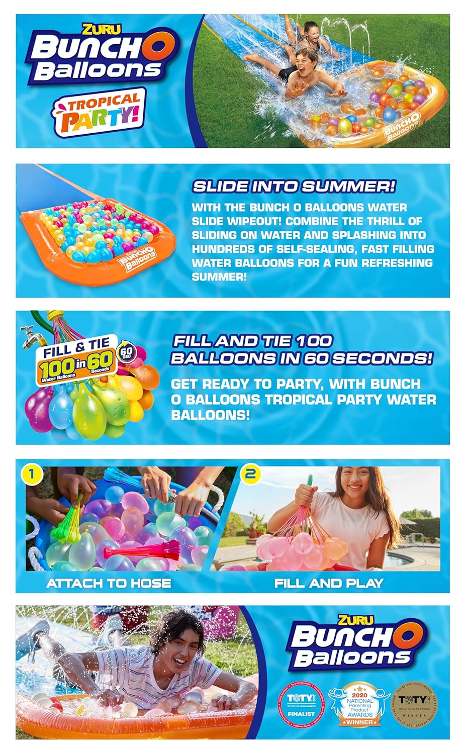 Contents: 1x 1-Lane Tropical Party Wipeout Water Slide; 3x Bunch O Balloons (100+ Self-Sealing Water Balloons)