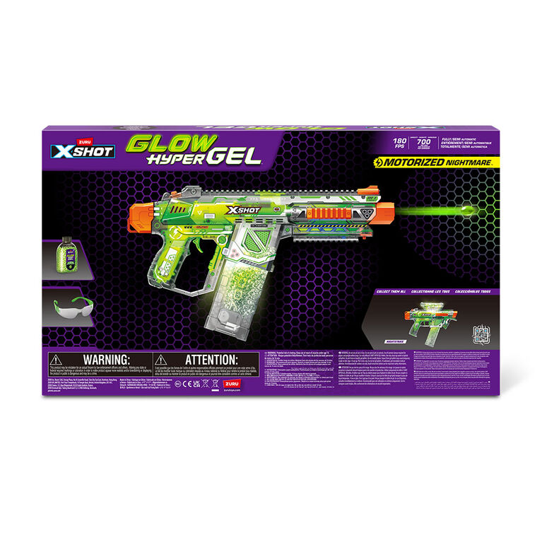 The XShot Hyper Gel Glow In The Dark Nightmare can blast Hyper Gel Pellets at 200 feet per second with its motorized fully and semi automatic modes. Battle all night long with the Nightmare's Glow in the Dark technology, and Glow in the Dark Gel Pellets, which will push your blaster battles to the Next Level! XShot Hyper Gel Glow In The Dark Nightmare has a 700 Pellet capacity mag. Stocked with 10,000 Glow in the Dark Hyper Gel Pellets, rechargeable battery and protective eyewear, just add water to start the ultimate Gel Blaster battle!