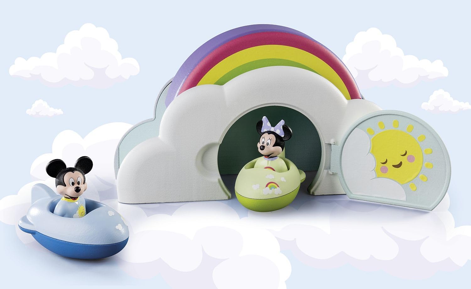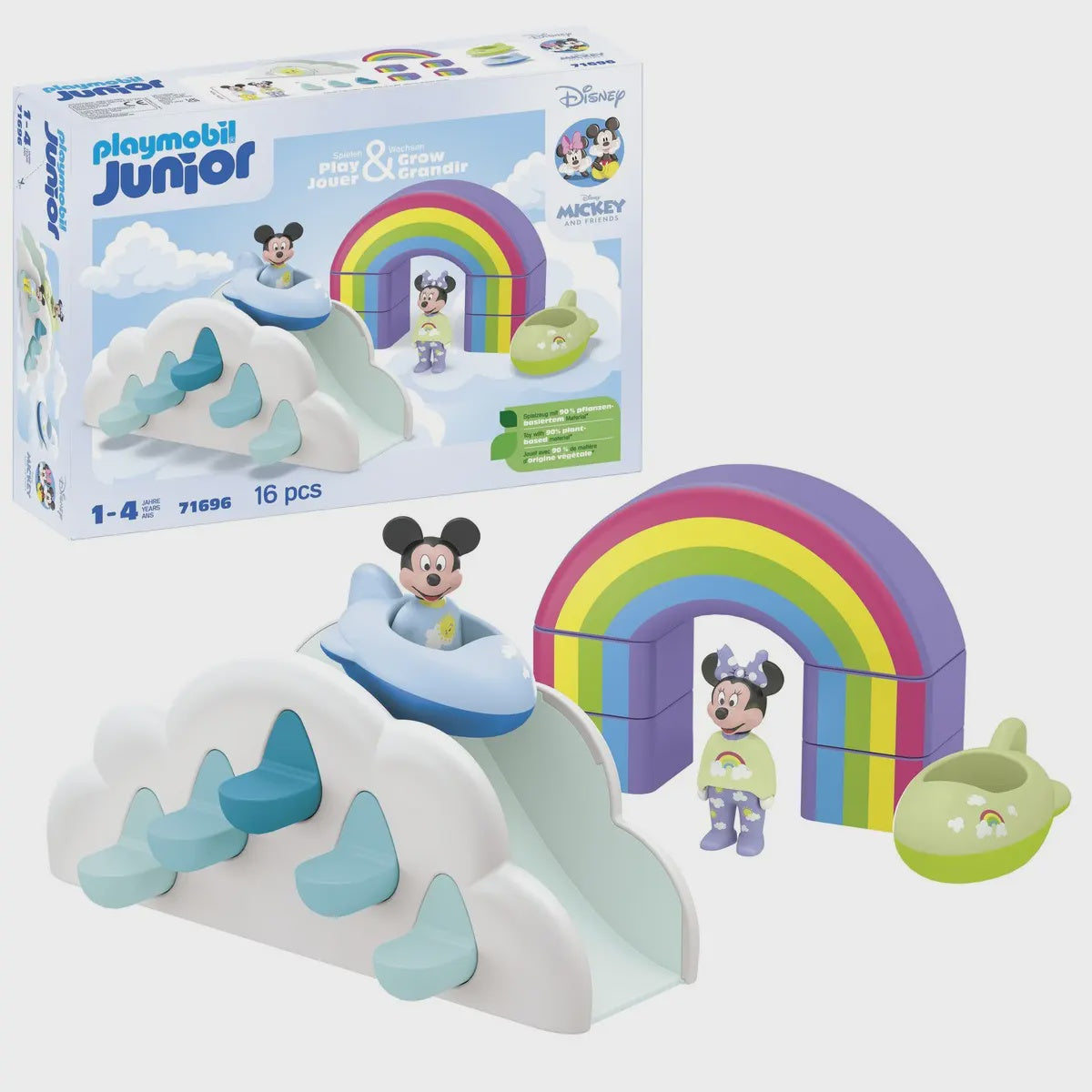 Stacking, rocking, sliding, rattling, puzzling, flying... high up in the clouds inspired by Disney's Mickey Mouse and Minnie Mouse, anything is possible. The Cloud House offers a plethora of fun: whether as a slide, a hideout, or with raindrops inserted as stairs - with this playground, your child can unleash their creativity. The colourful rainbow can also be used in various ways: your child can use it as a rattle, make Mickey and Minnie rock on the rainbow, or build a finish line for the cloud slide with additional stacking stones. Is it night or day? What's the weather like today? Is the sun shining or is it raining? Quickly to the hideout so no one gets wet! Is that a rainbow on the horizon? Your child can let Mickey and Minnie slide through it! Equipped with colour-coordinated dream planes, the figures are ready for sliding fun. Who zooms down the clouds fastest through the rainbow? And who manages to puzzle the raindrop stairs in the correct colour sequence? This set offers numerous opportunities for creative play and invites even the little ones to unleash their imagination and explore weather scenarios like sunshine, rain, or a rainbow with Mickey and Minnie.