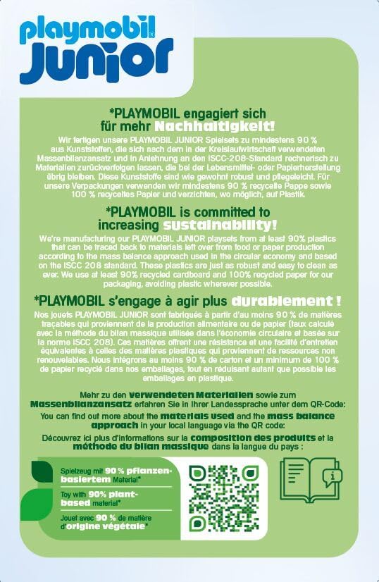 All PLAYMOBIL JUNIOR playsets are made with over 90% bio-based plastic (ISCC PLUS certified). The plastic can be traced back to bio-based feedstock using the mass balance approach. With this, we are committed to significantly reduce the use of fossil resources.