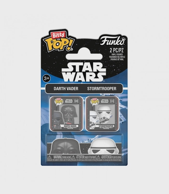 The world of POP! is getting bigger—and smaller—with Bitty POP! collectibles! Expand your Star Wars™ collection with this 2-pack featuring Bitty POP! Darth Vader™ and Bitty POP! Stormtrooper™! Bitty POP! collectibles are packaged in hard acrylic cases with detachable bottom lids. Detachable bottom lids double as acrylic bases, to which the Bitty POP! collectibles are adhered. Vinyl collectibles are approximately 0.9 in (2.3 cm) tall. Warning: Choking Hazard. Collectibles are small. Not for children under the age of 3 years old