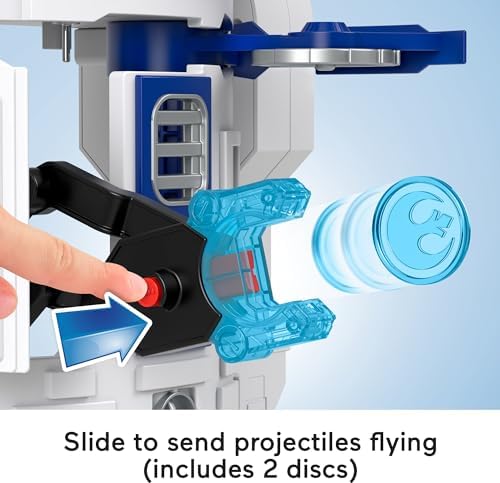 Hands-on play: roll the droid along on wheels, send projectiles flying from the launcher, spin the pretend blade, and lift the elevator on the back to raise periscope
