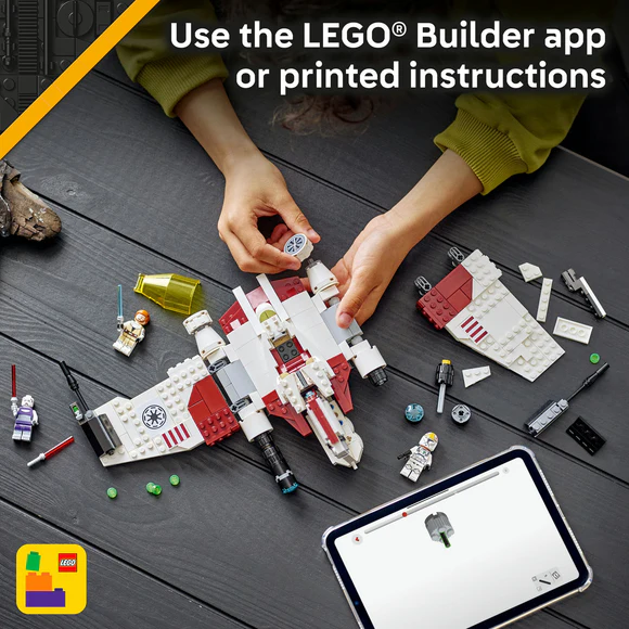 Enhance kids’ creative experience with the LEGO Builder app, which lets them zoom in and rotate a digital 3D version of the Star Wars starfighter as they build.