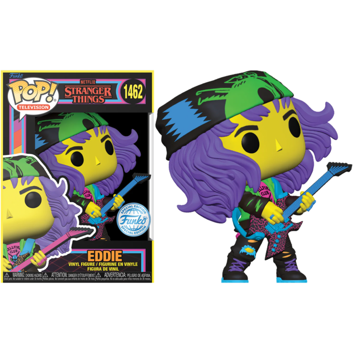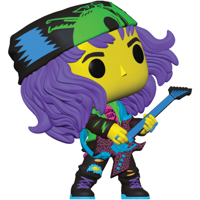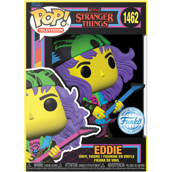 Funko's new wave of Stranger Things 4 Pop! Vinyl Figures features a range of favourites from the series, including Eddie, in his Hellfire Club t-shirt, black pants, bandana, and with his guitar in an awesome Blacklight finish!!