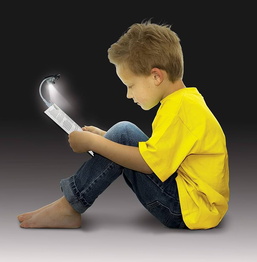 LEGO book light with adjustable flexible rubber neck and large clip so it's easy to read books of all sizes in darkness. Suitable for books, laptops & e-readers. Powered by 2 button cell batteries or USB.